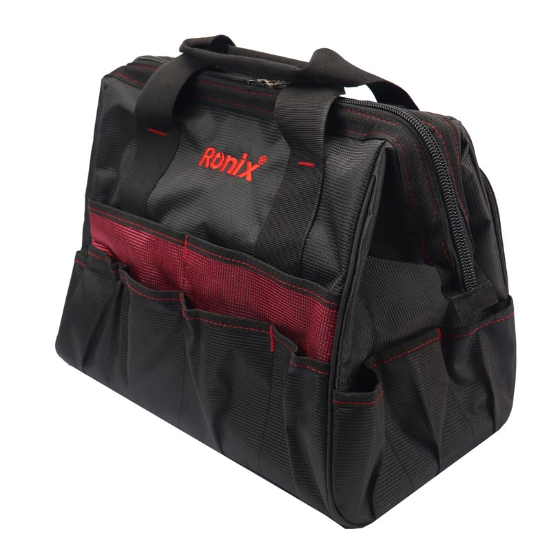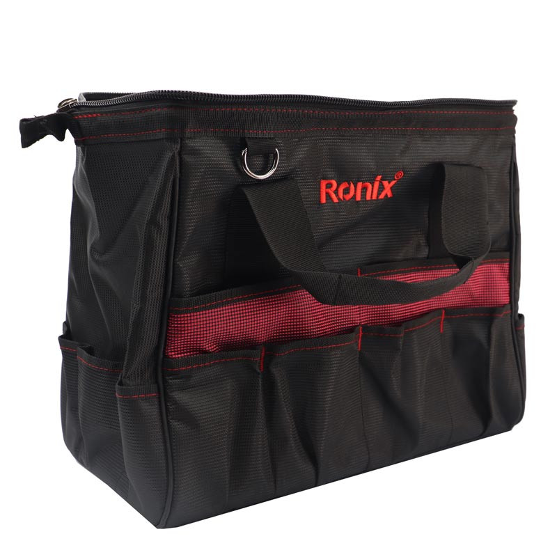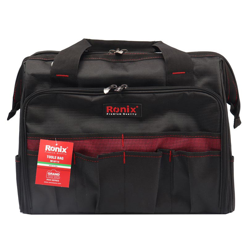 شرکت معتبر رونیکس یکی از تولید کنندگان معتبر ابزار های صنعتی می باشد که توانسته با تولید محصولات با کیفیت نظر مخاطبان بسیاری را به خود جلب کند. کیف ابزار دوشی RH9114 این شرکت از جنس برزنت دولایه بوده که موجب می شود این محصول از استحکام مناسبی در مقابل فشار و سایش بهره مند باشد. زیپ کیف صنعتی رونیکس نیز مقاومت مناسبی دارد تا شما نگرانی جهت خرابی آن در طولانی مدت نداشته باشید. کیف قابل حمل بزرگ Ronix RH9114 توان حمل ابزار آلات شما تا وزن حداکثر 17 کیلوگرم را دارد که توان مناسبی برای یک کیف ابزار به شمار می آید. تولز بگ Ronix جهت حمل راحت تر این کیف برای آن یک بند رو دوشی در نظر گرفته که موجب می شود تا شما هنگام جا به جایی ابزار توسط RH9114 احساس راحتی بیشتری داشته باشید. این محصول از 6 عدد جیب داخلی، 18 عدد جیب خارجی و 9 عدد جداکننده آچاری بهره می برد تا دسترسی شما به ابزار داخل آن در کمترین زمان ممکن صورت بگیرد.