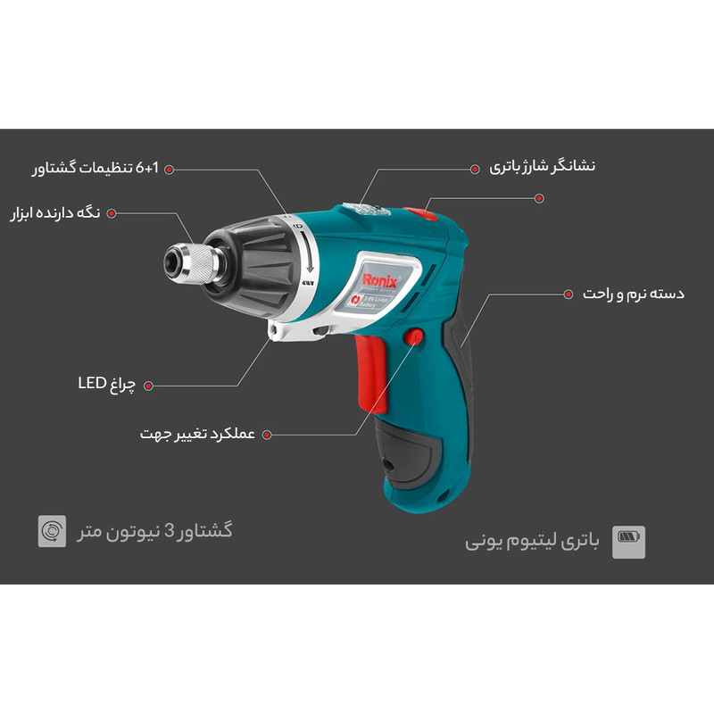 - جنس باتری: Lithium-Ion - ظرفیت باتری: 1500 میلیآمپر - حداکثر گشتاور: 3 نیوتن متر - سرعت گردش آزاد: 200 دور در دقیقه - مجهز به سه نظام 1/4 اینچ با کاربری سریع و آسان - با نشانگرLED شارژ باطری و چراغ LED جهت کار در محیط های تاریک - قابلیت تنظیم ترکمتر در 6+1 وضعیت مختلف