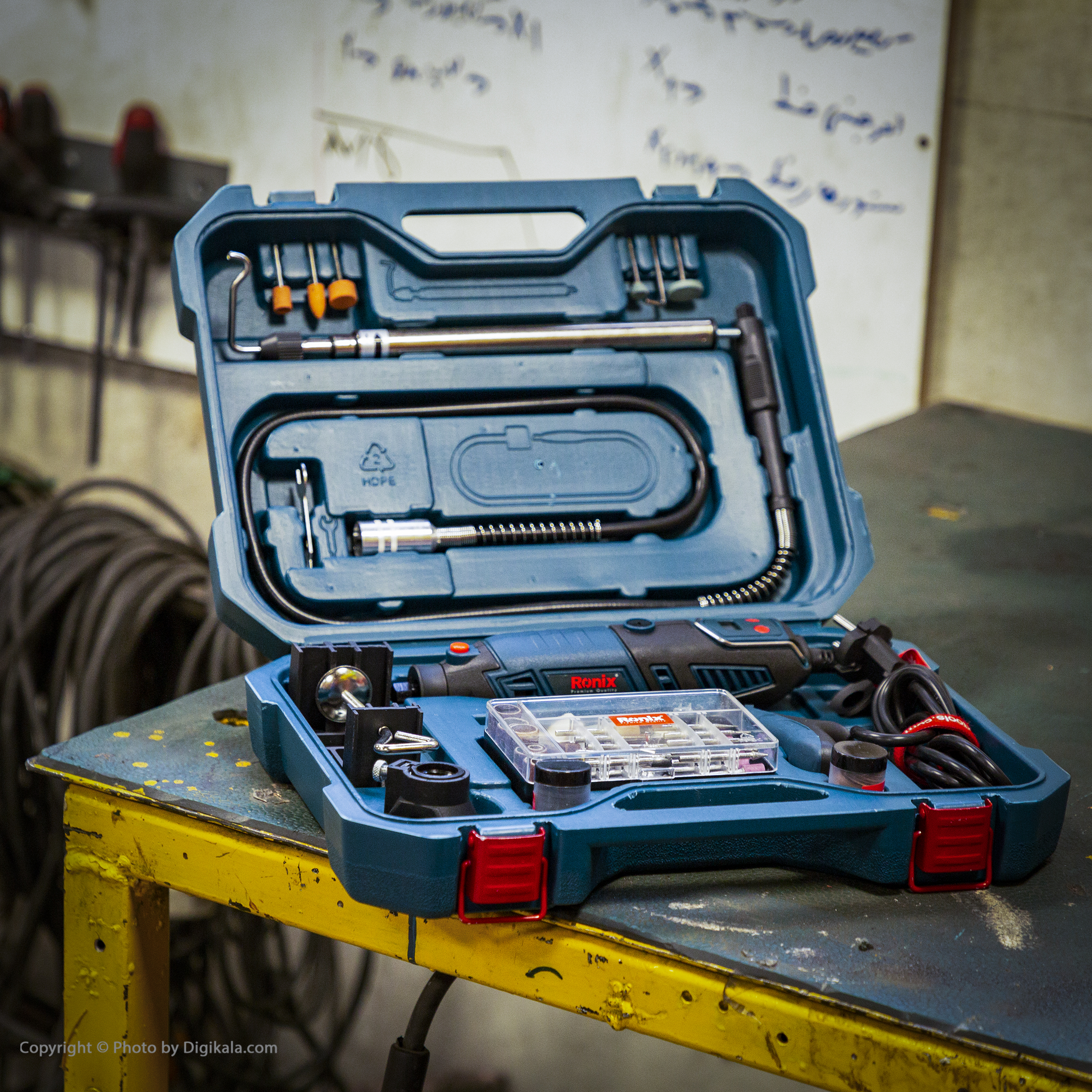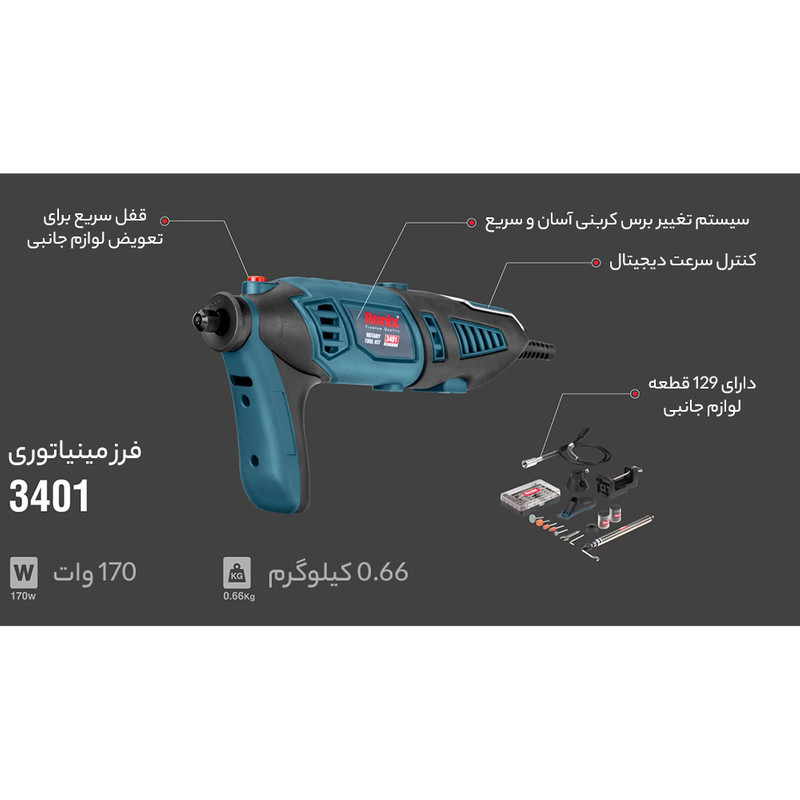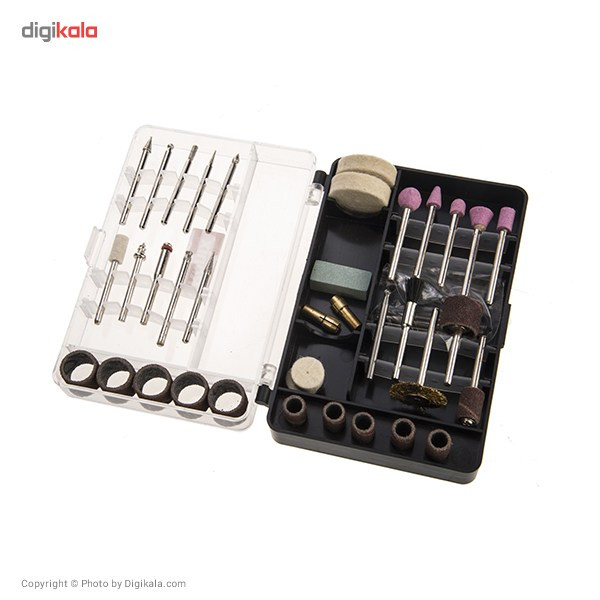 - مجهز به سیستم تغییر دور دیجیتالی - مجهز به 129 قلم انواع لوازم جانبی دستگاه - قدرت و کیفیت ساخت مناسب - بستهبندی خوب و حمل و نقل آسان - مجهز به 3 سایز کولت - دارای بلبرینگ ضدغبار - طول کابل برق: 1.5 متر