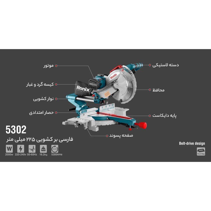 - مجهز به سیستم قفل کن پیشرفته و سریع میز برش در 9 زاویه کاربردی جهت انجام برش های بازویی