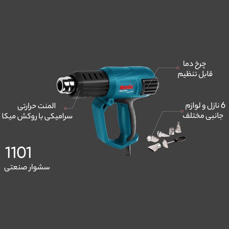سشوار صنعتی برقی 1101 رونیکس، انتخابی مطمئن در مصارفی نظیر رنگزدایی، اتصالات، انقباض PVC، جوشکاری و انحنادادن به قطعات پلاستیکی، خشککردن و رنگزدایی است. این دستگاه کاربردی، با برخورداری از موتور 2000 وات قدرتمند، دارای تنظیمات نهگانه دما و حجم هوای خروجی است تا نیازهای مختلف کاربران را برآورده کند.