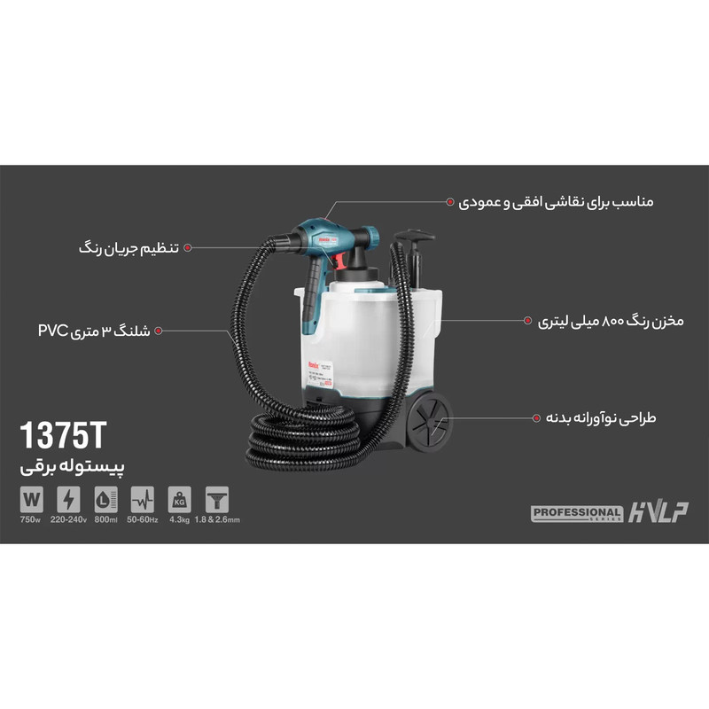 مجهز به موتور پر قدرت 750 وات تحت سیستم رنگ پاشی HVLP طراحی منحصر به فرد در قسمت خروجی نازل جهت پاشش حرفه ای در یه حالت عمودی،افقی و گرد بدنه مقاوم چرخ دار جهت سهولت در جابجایی دسته تلسکوپی جهت تنطیم ارتفاع دلخواه دارای ظرف جمع آوری شلنگ قابلیت باز شدن سری قسمت تفنگی جهت تمیز کردن آسان دستگاه